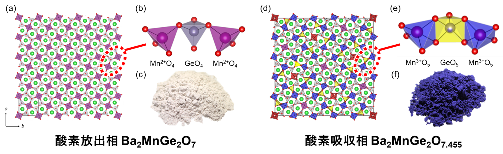 図1. Ba2MnGe2O7+δの (a, b, c) 酸素放出相および (d, e, f) 酸素吸収相における結晶構造・局所構造・試料の色.